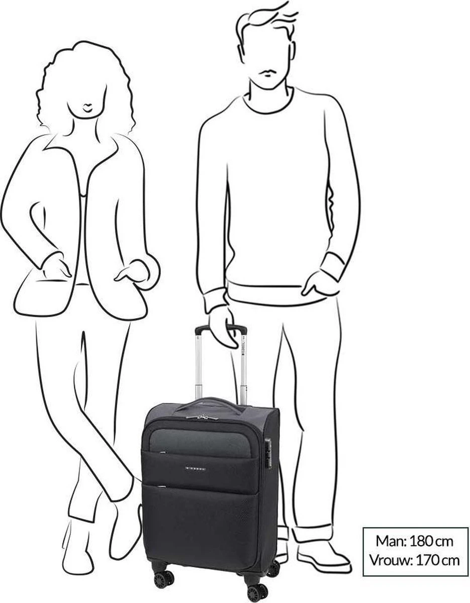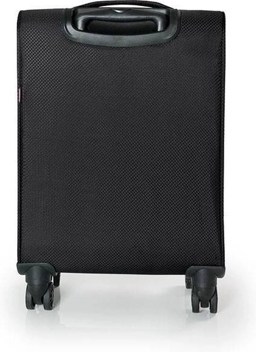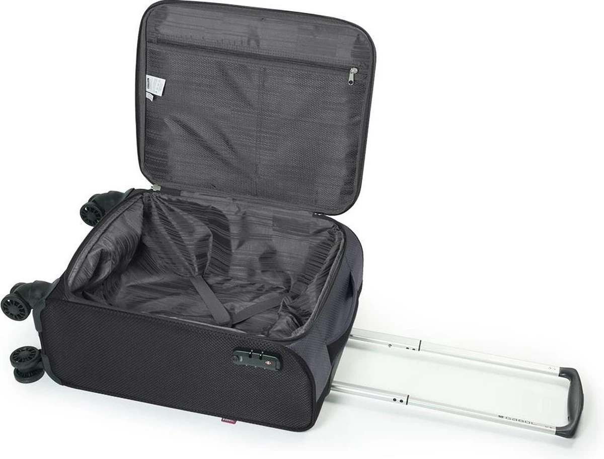 Lichtgewicht handbagage koffer uit de Cloud serie van Gabol. De koffer valt binnen de IATA norm dus kan probleemloos mee als handbagage bij de vliegmaatschappijen die deze norm hanteren. De koffer is aan de binnenkant helemaal gevoerd en voorzien van spanbanden om de bagage mee vast te zetten. In de klep zit nog een extra ritsvak. Op de voorzijde van de koffer zitten twee ritsvakken en op de zijkant van de koffer zit een vast cijferslot waarmee u de koffer op slot kunt zetten. De 4 soepele zwenkwielen zorgen voor optimaal reiscomfort en de trekstang is in hoogte verstelbaar.