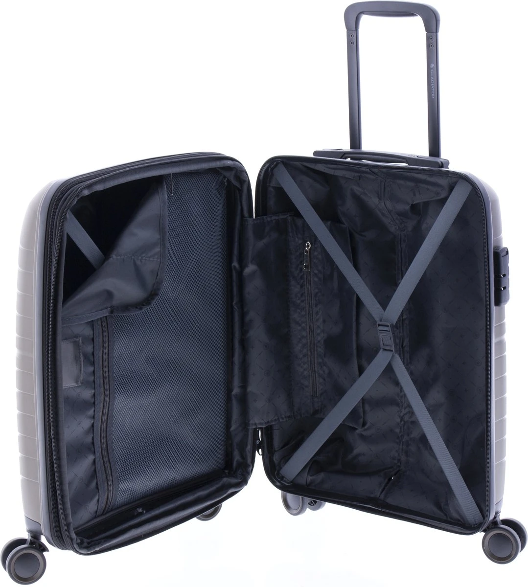 Mooie hardschalen handbagage koffer gemaakt van recyclebaar polypropyleen. Koffer is voorzien van een ritssluiting rondom en een extra expandable rits waarmee de koffer qua volume te vergroten is van 36 naar 40 liter. Binnenin gevoerd en voorzien van tussenschot met ritssluiting, ritsvakje en spanbanden. Koffer is op slot te zetten middels een vast cijferslot op de zijkant van de koffer. Handvat op bovenkant en voorzien van comfortabel 4-wiel systeem.