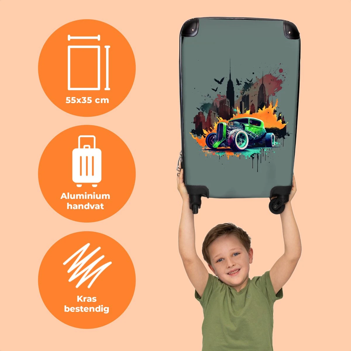 Zoek je nog een unieke koffer voor je kind? Dan is deze fotokoffer van NoBoringSuitcases misschien wel iets voor jou! Op de koffer staat een vintage auto besmeurd met gekleurde verf. Op de achtergrond staat een skyline van New York met een bruine veeg verf.