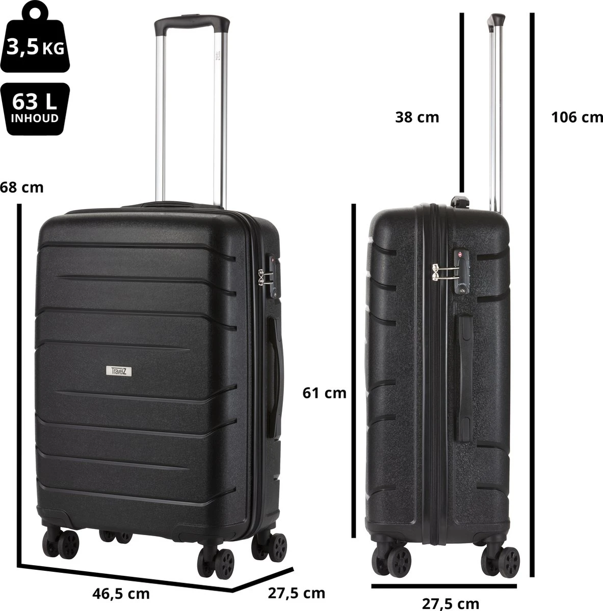 De TravelZ Big Bars is al jaren één van de best verkochte koffers van het Nederlandse merk TravelZkoffers. De Big Bars koffers zijn een echte lichtgewicht, erkend met een internationaal TSA-cijfercombinatieslot, soepele trekstang in verschillende standen voor lange en kleine personen, 4 dubbele wielen die volledig rondraaien, een compleet interieur met ritsvak en spanbanden en gemaakt uit ijzersterk polypropyleen. Voordeel van dit materiaaltype is dat het materiaal meeveert en hierdoor bij een enorme impact geen inslag krijgt. Meerdere koffers? Zoek op de TravelZ Big Bars kofferset en pak je prijsvoordeel bij twee of drie koffers. Bekijk kritisch welk formaat koffer je qua afmetingen en literinhoud nodig hebt voor de reis. Afmeting is incl wielen.